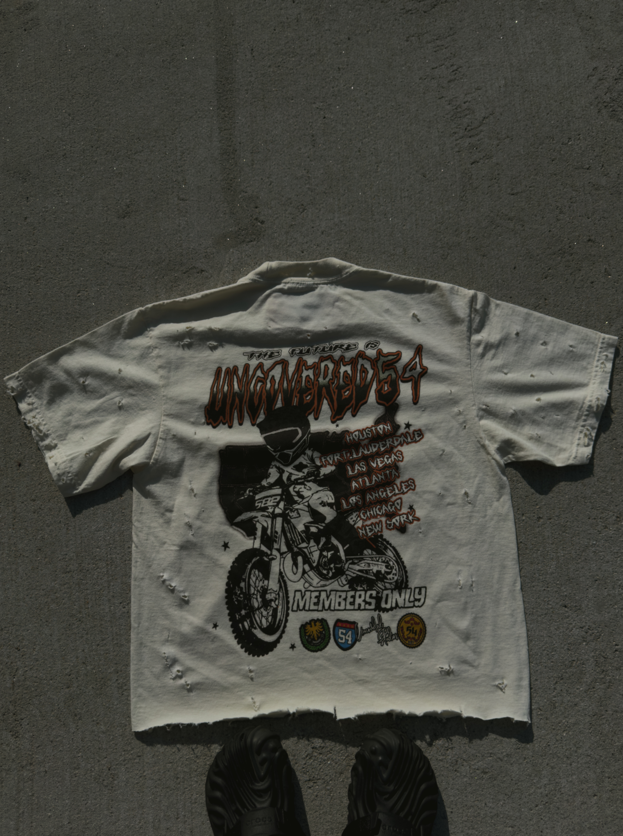 • Born from the stream, created by the community. The Distressed "Chat Made" Tee was created live by Team 54 supports  – a true members only tee.